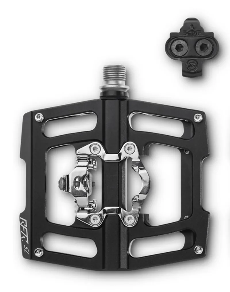 CNC-machined high-end flat pedal with clip system on one side (SPD compatible), replaceable anti-slip pins and cartridge bearings.