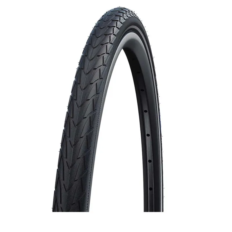 This is the Schwalbe Marathon Racer 700C RaceGuard Wired Commuter Tyre – Reflex. The fastest and lightest Marathon. It has a proven RaceGuard protection belt. This belt was developed especially with racing in mind. A synthesis of special India rubber and several layers of nylon fabric offers very effective protection against penetration punctures. Featuring Schwalbe’s SpeedGrip compound which is a multilevel dual compound providing high levels of grips and low levels of rolling resistance. Now with a reflective sidewall for added visibility.